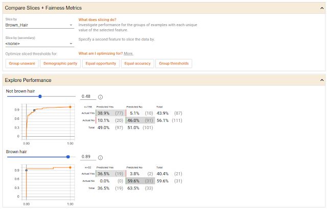 下图所示数据集中的面部图像按照头发是否为棕色分开,两个图像中的每一组都建立一条ROC曲线和一个预测结果的混淆矩阵,再设置一个置信度滑块,设定模型必须在超过某一置信度时才能判定目标的面部是微笑的。本例中,What-If工具自动设置两组的置信度阈值,以优化模型,实现机会均等。