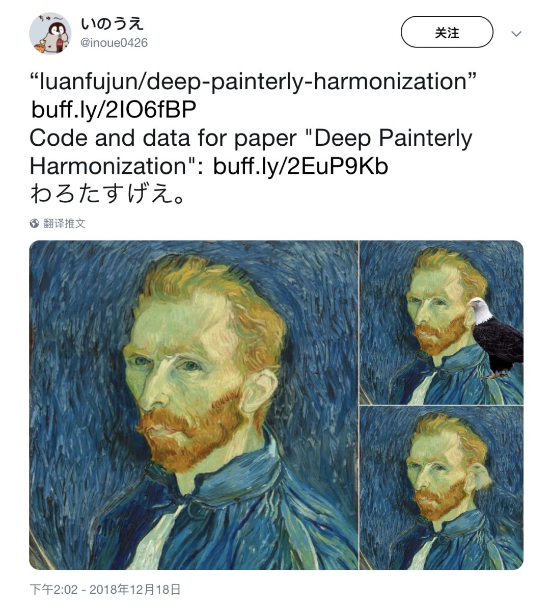 也有网友给梵高的肩上加了一只别致的小鸟。